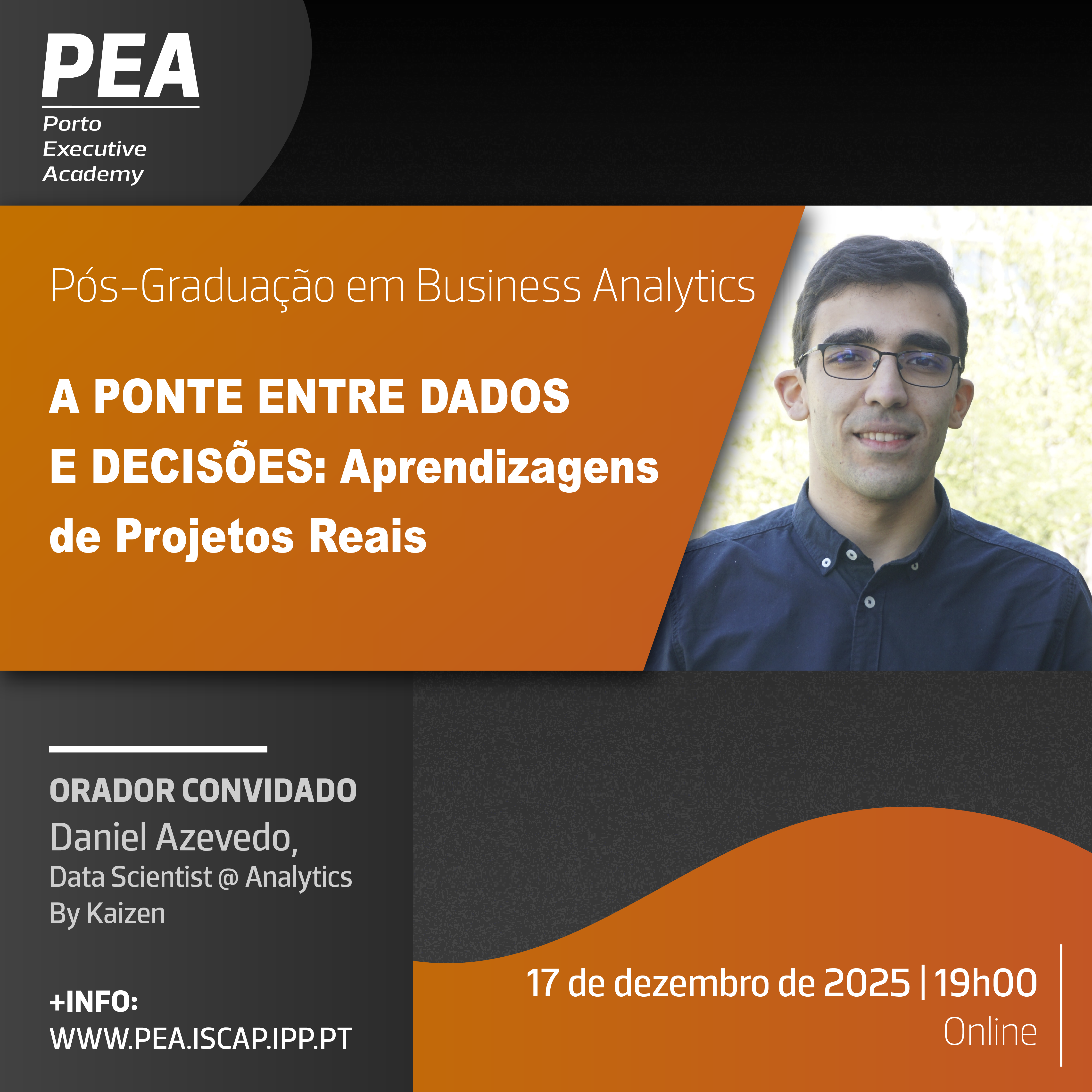 No próximo dia 17 de dezembro de 2025, às 19h00, em formato online, decorrerá um seminário com o tema "A Ponte entre Dados e Decisões: Aprendizagens de Projetos Reais", no âmbito da Pós-graduação em Business Analytics.