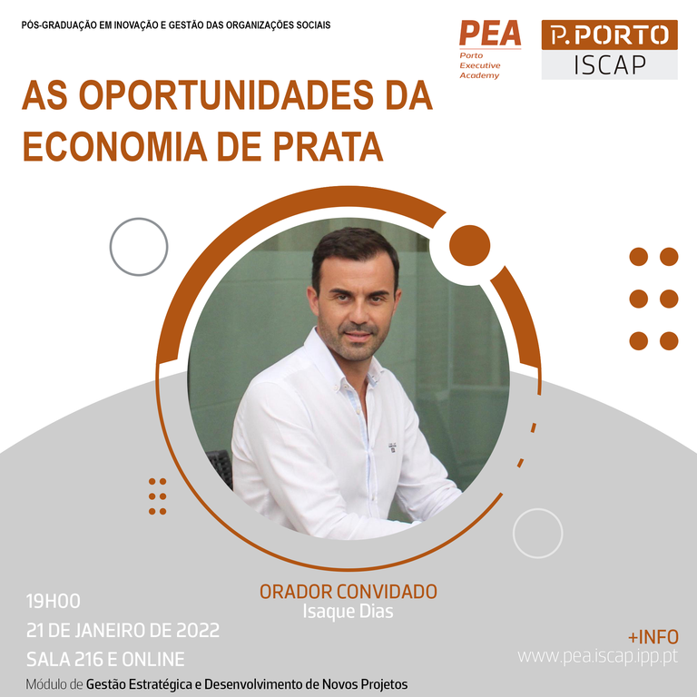 No próximo dia 21 de janeiro de 2022, realizar-se-á um seminário subordinado ao tema "As oportunidades da economia de prata", inserido no âmbito do módulo de “Gestão estratégica e desenvolvimento de novos projetos” da Pós-Graduação em Inovação e Gestão das Organizações Sociais da Porto Executive Academy.