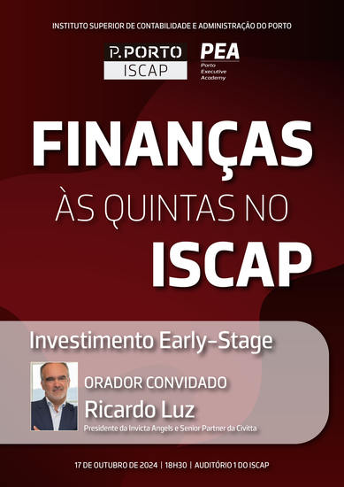 O Instituto Superior de Contabilidade e Administração do Porto (ISCAP) e a Porto Executive Academy (PEA) vão dar início a um ciclo de encontros mensais, denominado "Finanças às Quintas”, que pretende promover o debate e a partilha de conhecimento sobre temas relevantes na área das finanças empresariais. A primeira sessão, intitulada de "Investimento Early-Stage", está agendada para o dia 17 de outubro de 2024, no auditório 1 do ISCAP, entre as 18h30 e as 19h30, e vai contar com a presença de Ricardo Luz, presidente da Invicta Angels.