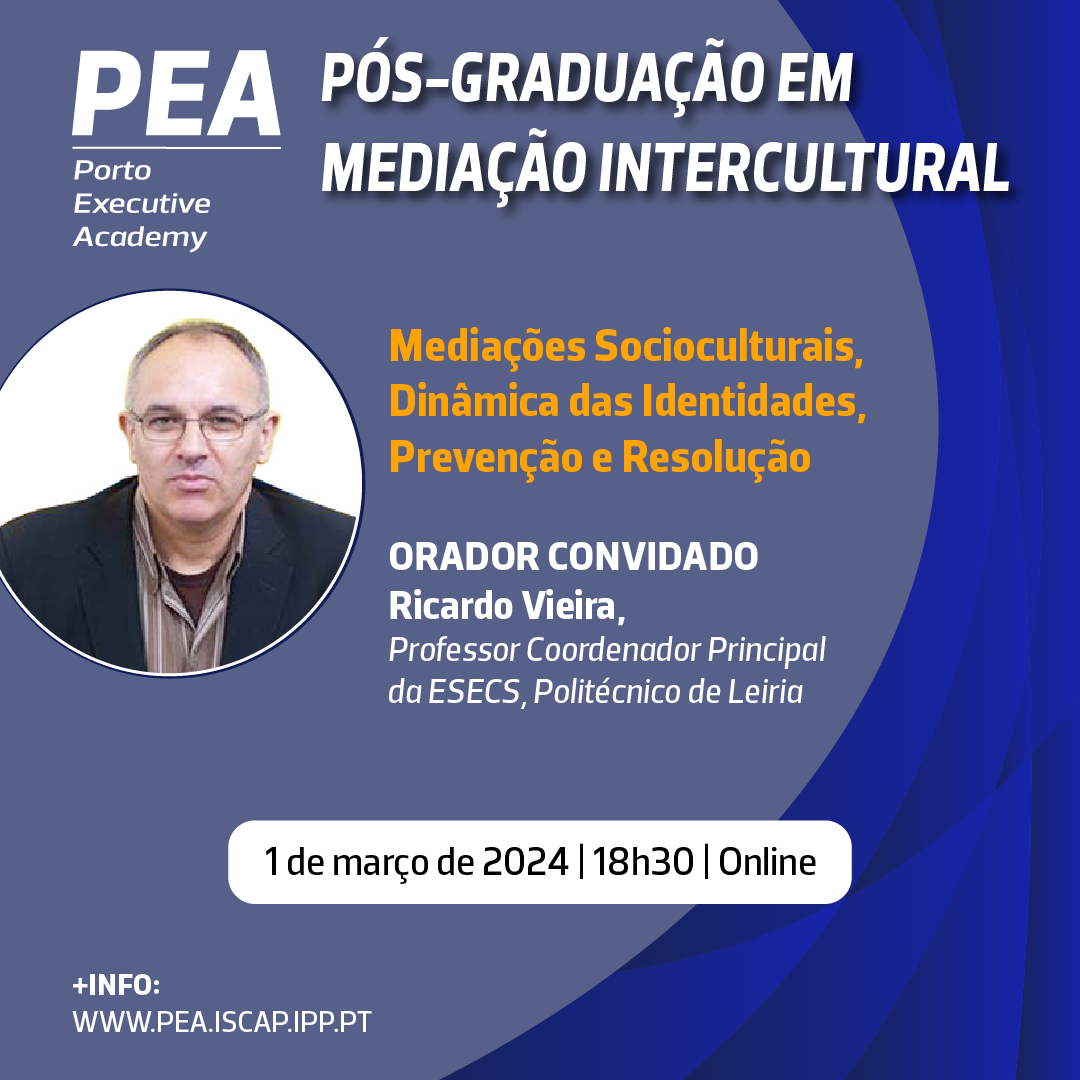 No próximo dia 1 de março de 2024, pelas 18h30, decorrerá a palestra denominada "Mediações Socioculturais, Dinâmica das Identidades, Prevenção e Resolução" com o orador convidado Ricardo Vieira, Professor Coordenador Principal da ESECS, Politécnico de Leiria, no âmbito da Pós-Graduação em Mediação Intercultural.