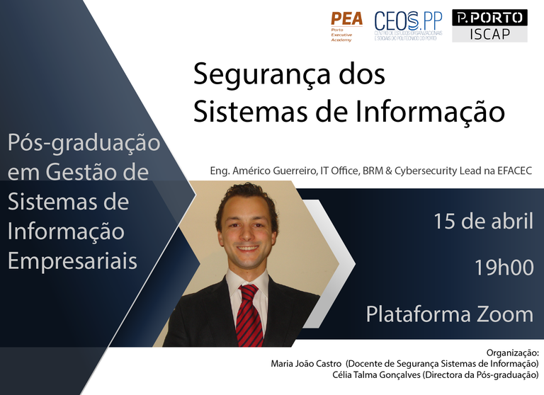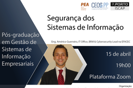 Este seminário encontra-se inserido no âmbito da Pós-graduação em Gestão de Sistemas de Informação Empresariais e conta com a presença do orador convidado Eng. Américo Guerreiro, IT Office, BRM & Cybersecurity Lead na EFACEC.