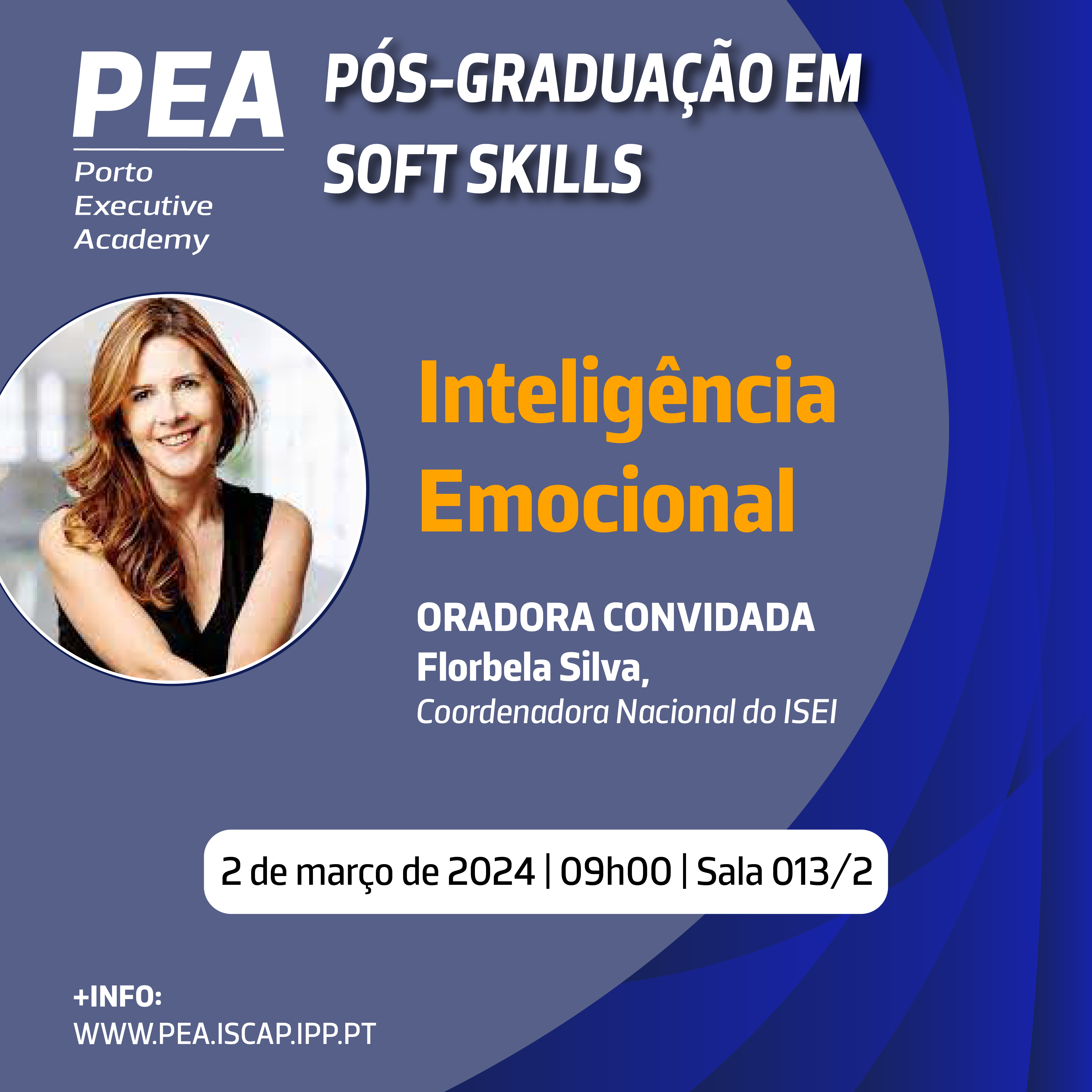 A direção da Pós-Graduação em Soft Skills da Porto Executive Academy (PEA) convida todos os interessados a estarem presentes no próximo dia 2/mar (Sábado) - 9.00, na sala 013-2 do ISCAP, no Seminário sobre Inteligência Emocional conduzido pela Eng. Florbela Silva.