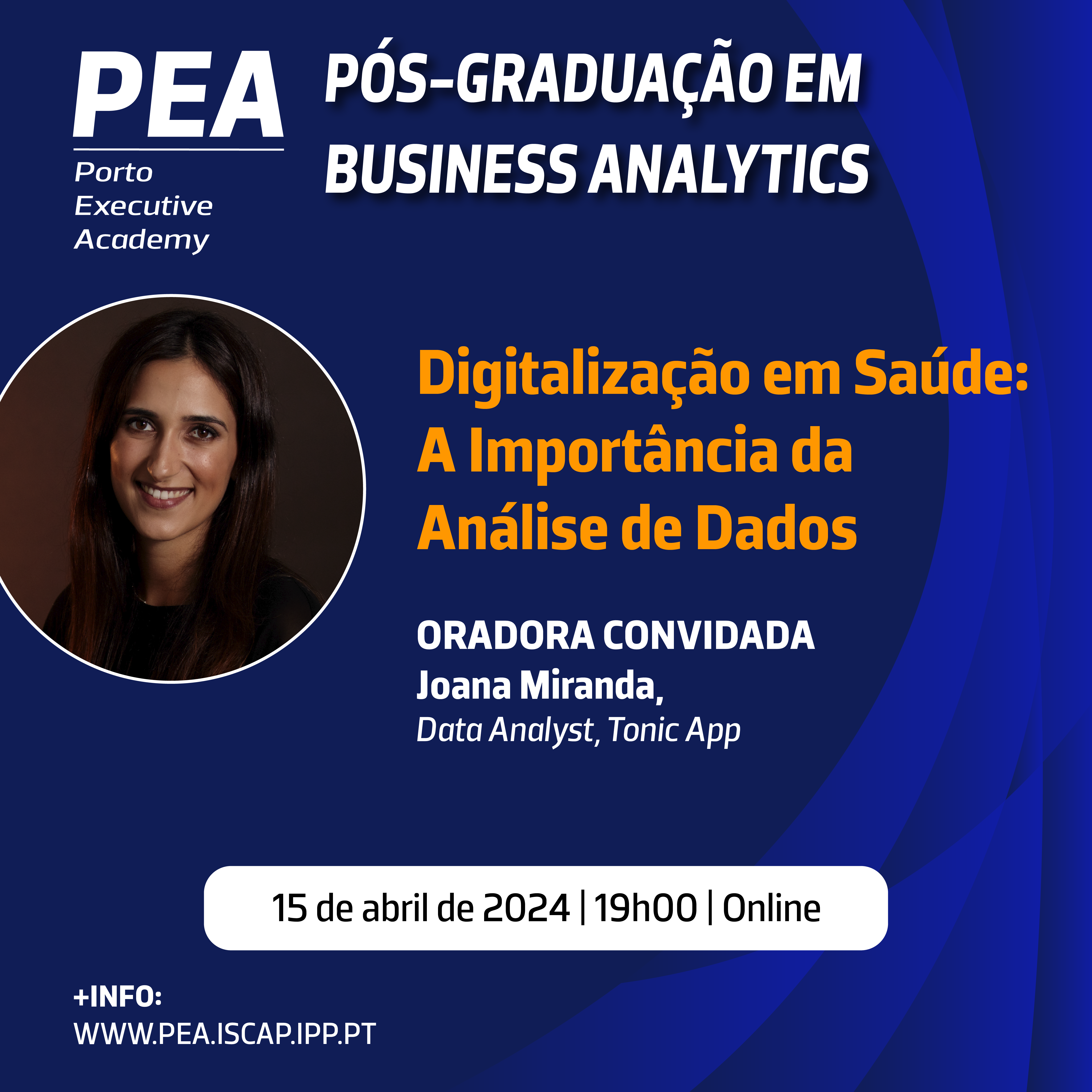 No âmbito da Pós-Graduação em Business Analytics da PEA realizar-se-á no dia 15 de abril de 2024, às 19h00, um seminário online imperdível para estudantes e profissionais interessados no impacto da tecnologia no setor da saúde. O seminário versará o tema crucial da digitalização em saúde e a importância da análise de dados neste setor.