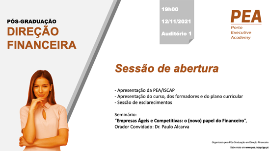 No próximo dia 12 de novembro de 2021, realizar-se-á a Sessão de Abertura da Pós-graduação em Direção Financeira.