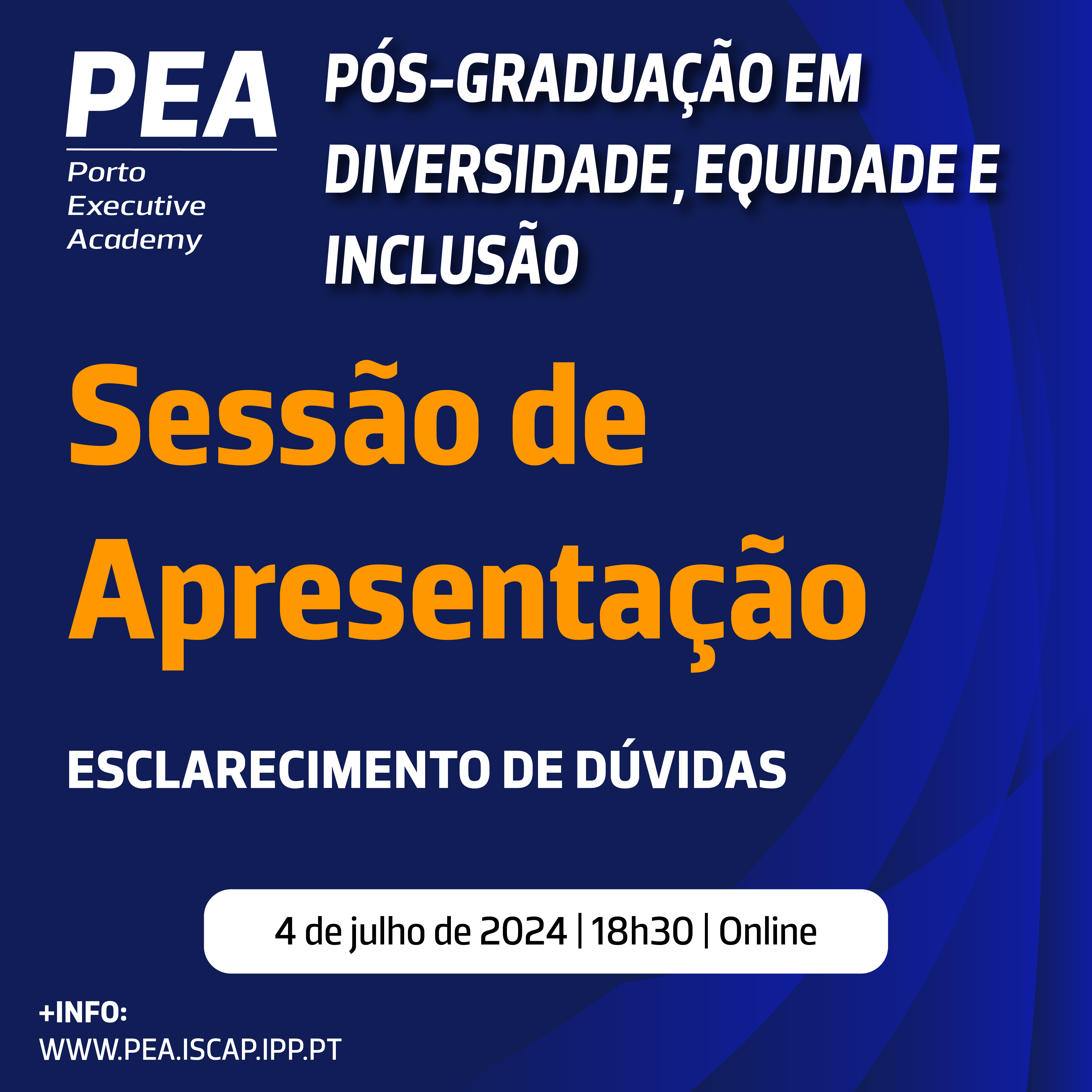 No próximo dia 4 de julho de 2024, realizar-se-á, pelas 18h30, uma Sessão de Apresentação e Esclarecimento de Dúvidas da nova pós-graduação em Diversidade, Equidade e Inclusão.